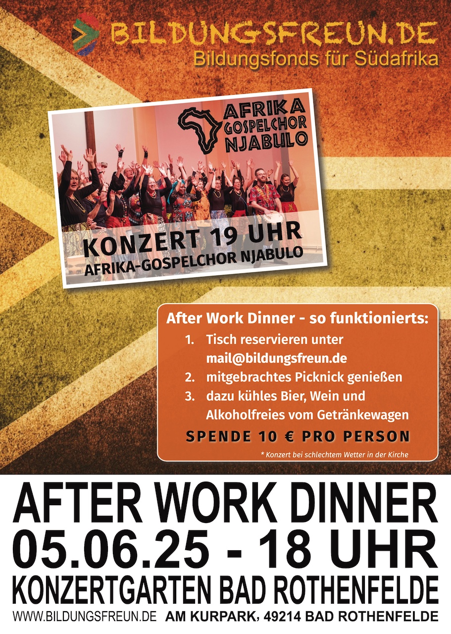 Freuen Sie sich auf einen schönen Abend mit Picknick und einem Konzert des Afrika-Gospelchores Njabulo. Wie immer reservieren Sie sich einen Tisch unter mail@bildungsfreun.de, genießen ihr mitgebrachtes Picknick und Getränke von unserem Getränkewagen. Außerdem erwarten Sie Informationen aus unserer Partnerschaft mit Südafrikaund viele nette Menschen.