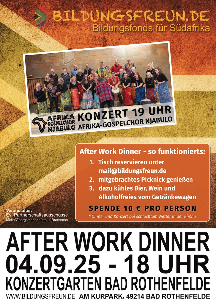 Freuen Sie sich auf einen schönen Abend mit Picknick und einem Konzert des Afrika-Gospelchores Njabulo. Wie immer reservieren Sie sich einen Tisch unter mail@bildungsfreun.de, genießen ihr mitgebrachtes Picknick und Getränke von unserem Getränkewagen. Außerdem erwarten Sie Informationen aus unserer Partnerschaft mit Südafrikaund viele nette Menschen.